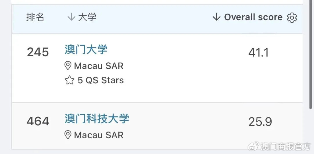 2. 澳门科技大学,第464位,上升41位