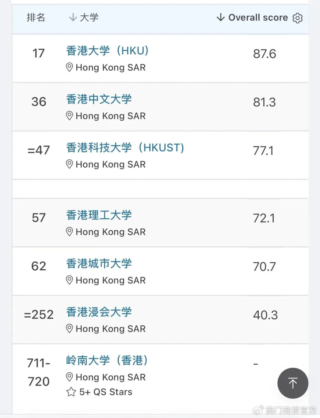 港澳高校本次均获得不错排名
