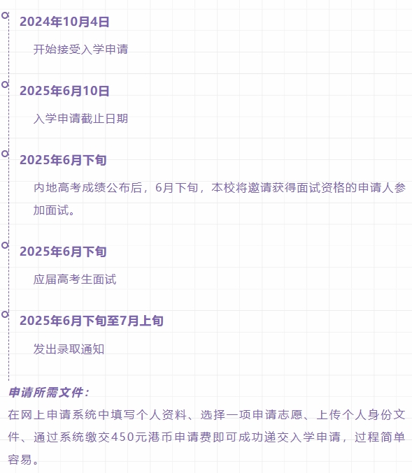 (3)日程安排:申请时间为 2024 年 10 月 15 日至 2025 年 6 月 10 日;录取通知、办理来港签证在 2025 年 6 月下旬至 7 月上旬;办理入学注册及参加大学迎新活动在 2025 年 8 月中旬。