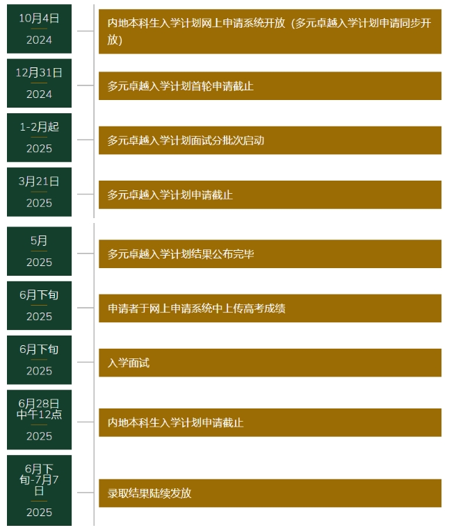 (2)申请流程:申请日期为 2024 年 10 月 4 日至 2025 年 6 月 10 日;面试时间在高考成绩公布后,2025 年 6 月下旬将陆续邀请获得面试资格的申请人参加面试;录取通知在 2025 年 6 月下旬至 7 月上旬。