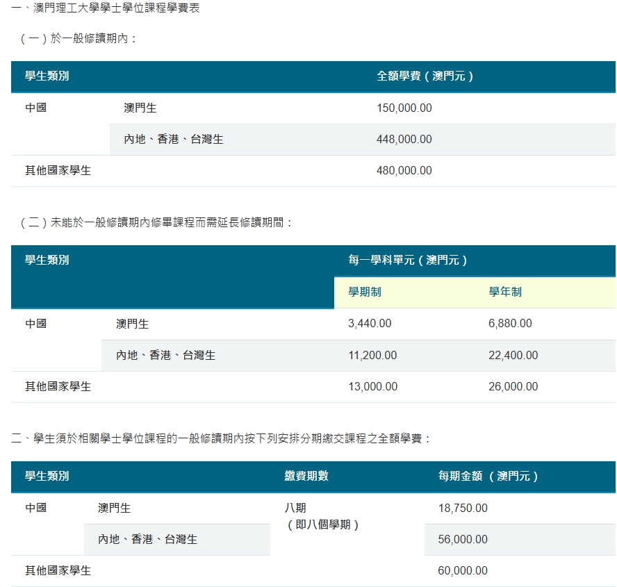 (4)学费标准:就读澳门大学4年学费约为490,400澳门元(约人民币430,000元),四年制课程分八期缴交(即八个学期),每期缴交学费约为61,300澳门元(约人民币53,750元)。