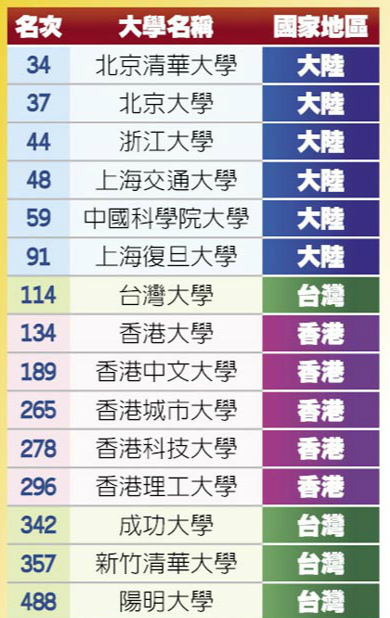 据台湾《旺报》报道,台湾大学近日公布了自行调查的世界大学排行榜,数据显示,大陆不仅有多所高校榜上有名,清华、北大这样的顶尖学校,也分别排行第34、37位。反观台湾的高等学府台大,却仅位居第114名。